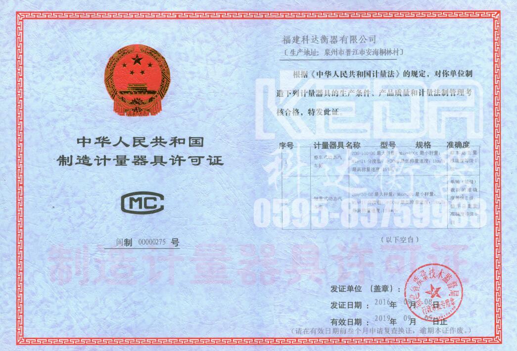福建科達衡器獲得福建首張動態(tài)汽車衡制造許可證